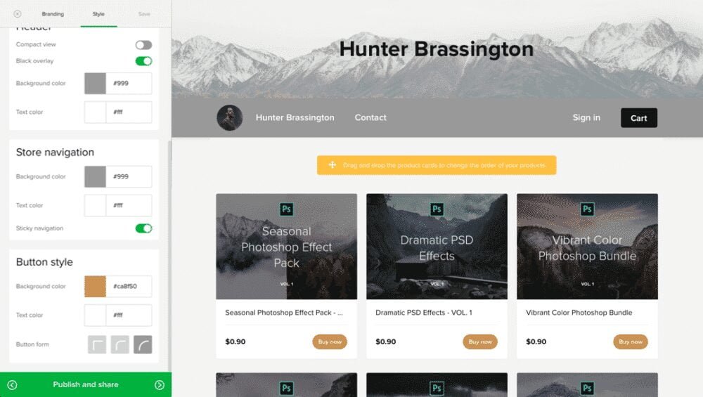 Sellfy provides a variety of built-in features included with each plan, such as custom domain settings, store customization, sales analytics, discount codes, third-party integrations, purchase email customization and more. We also offer more sophisticated tools such as email marketing and upselling with advanced plans (Business and Premium) to help you promote your online business.